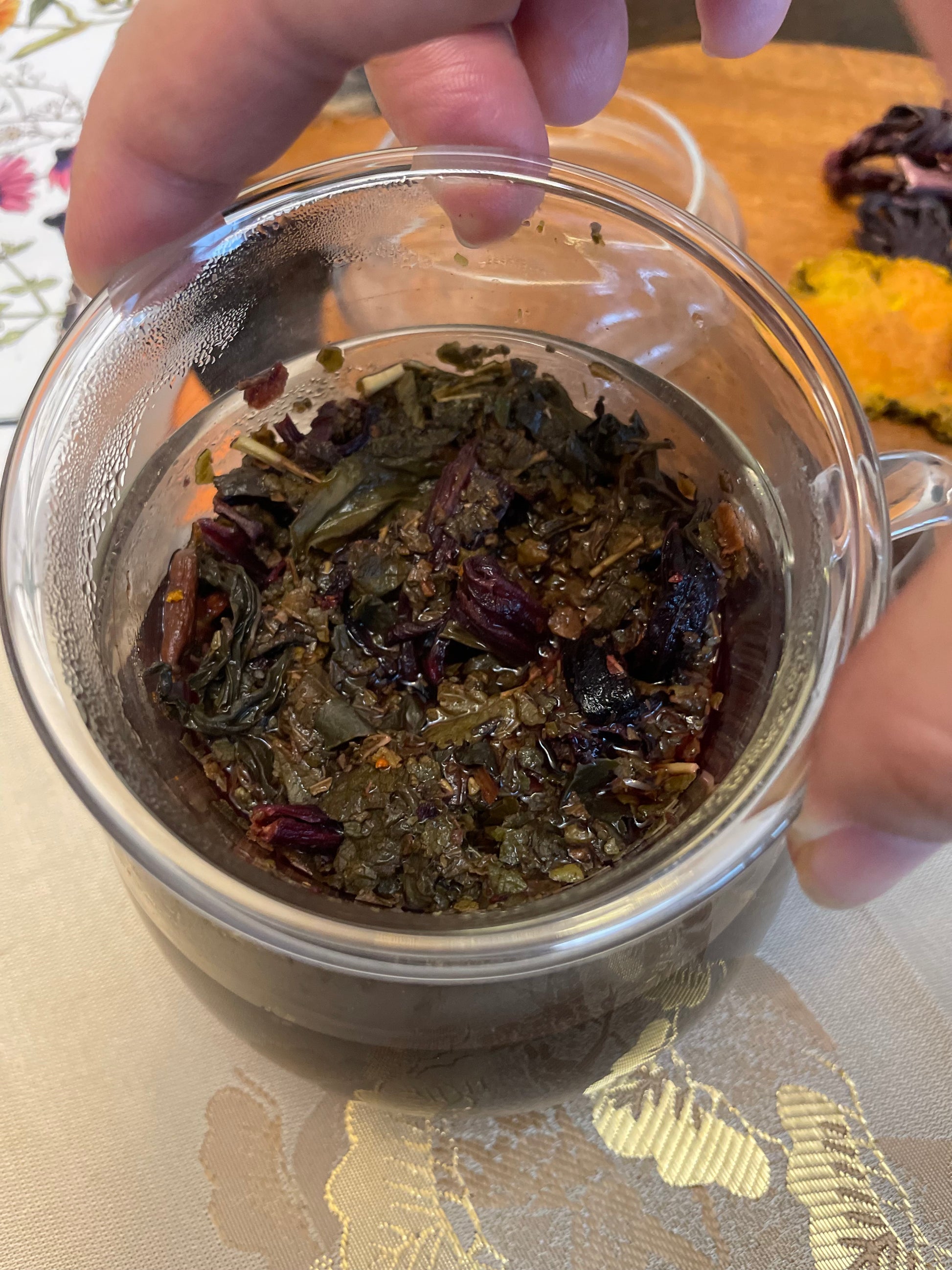 Raspberry leaf, hibiscus flower, dandelion root, green tea, ginger root, turmeric